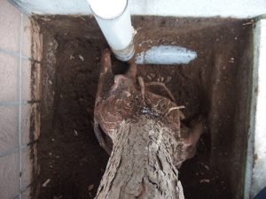 思った通り根っこが雨どいの管を押し上げていました・・。