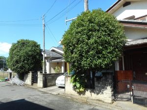 写真手前のキンモクセイは、車の停車に枝葉が邪魔になるので強剪定します。