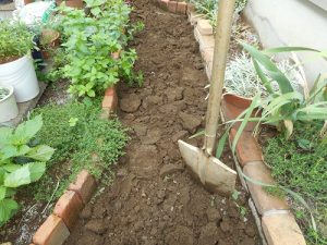 除草をおこない、根まで取り除きます。土をほぐし地面を平らにならして