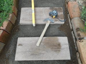 平らになった地面に砂で下地をつくり平板を均等に並べていきます!