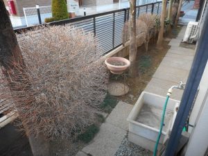 通路のドウダンも綺麗に仕立て、ハナミズキの不要な下枝も剪定し、通路が通りやすくなりました。