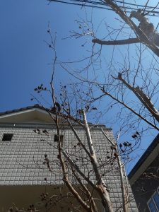 建物の二階テラスより、やや上まで伸びた枝は落葉時期はまだ目立ちませんが