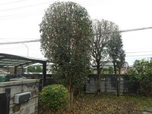 キンモクセイ(手前)・レッドロビン(奥)はできるだけ小さく強剪定しました!!