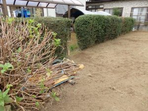 垣根はご希望の高さまで低くし、アジサイも一回り小さく剪定しました。